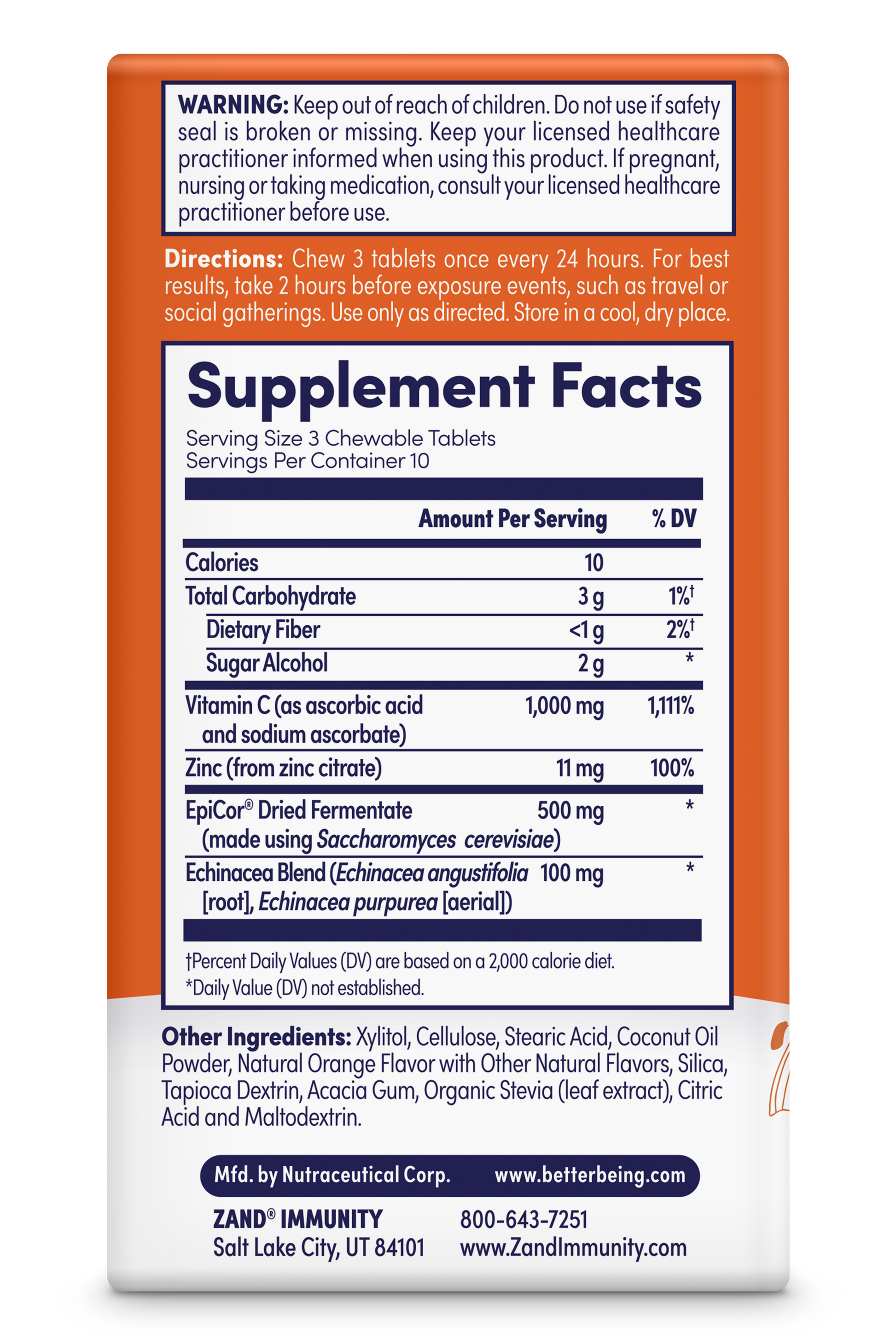 Vitamin C (Ascorbic Acid), Zinc, Epicor, Black Elderberry, Xylitol, Coconut Oil Powder, Stearic Acid, Natural Flavors, Silica, Tapioca Dextrin, Organic Stevia Leaf Extract, Citric Acid, Acacia Gum, and Maltodextrin