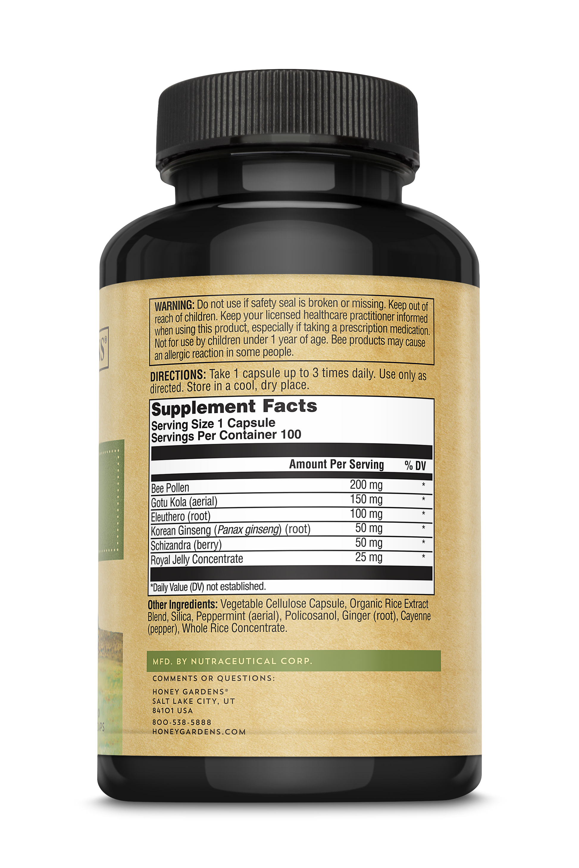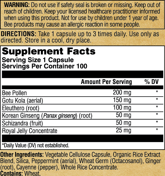 bee pollen, gotu kola, eleuthero, korean ginseng, schizandra, organic royal jelly concentrate, vegetable cellulose, organic rice extract blend, silica, peppermint leaf, ginger root, cayenne pepper, whole rice concentrate and oztacosanol (from wheat)