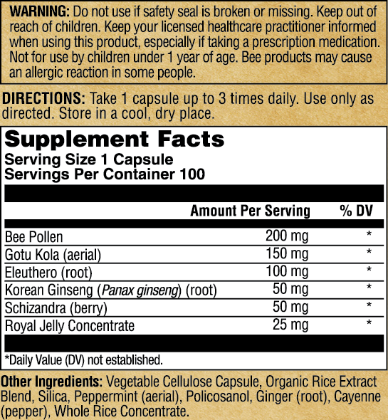 Boost from the hive: This powerful formula blends bee pollen and organic royal jelly with time-honored herbs like gotu kola, eleuthero, Korean ginseng, and schizandra—plus a warming touch of peppermint, ginger, and cayenne.